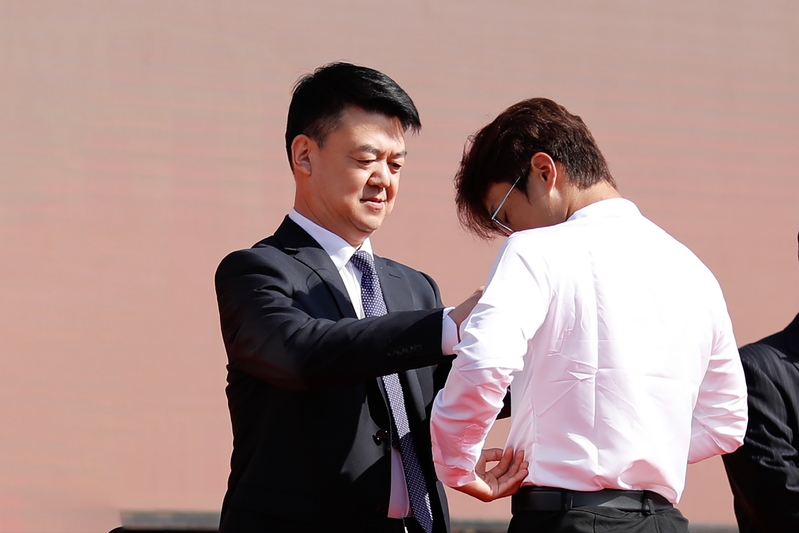 校党委书记刘洋为新生代表佩戴校徽