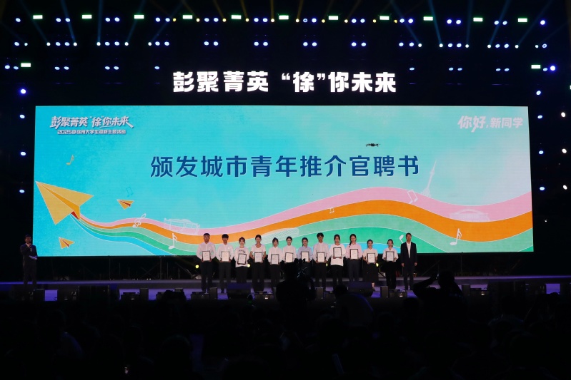 活动现场,《徐州好young》以情景式推介的形式,展现了徐州的自然风光与人文底蕴,传递了城市的气质与温度。正式发布了大学生综合服务礼包,涵盖“乐行、乐享、乐学”等内容,为新生融入徐州提供便利。成立了汇聚40余家优质企业的大学生高质量实习见习就业服务联盟,未来将提供更丰富、更优质的岗位资源。活动还对获得“创新创业之星”“实习实践之星”“志愿服务之星”荣誉徽章的优秀大学生进行了表彰,并为一批有实力、有创意的“城市青年推介官”颁发了聘书。活动中,2025级大学新生代表集体言志《我在徐州写青春》,发出“放飞梦想 筑梦徐州”的青春宣言。