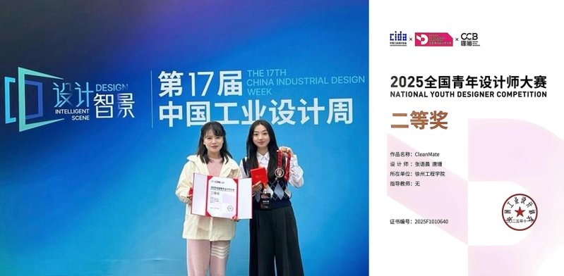 近日,2025全国青年设计师大赛(NATIONAL YOUTH DESIGNER COMPETITION)评选结果正式揭晓。我校机电工程学院教师唐珊与学生张语晨合作的作品《CleanMate》凭借新颖的设计理念和扎实的专业功底,荣获工业设计类二等奖。