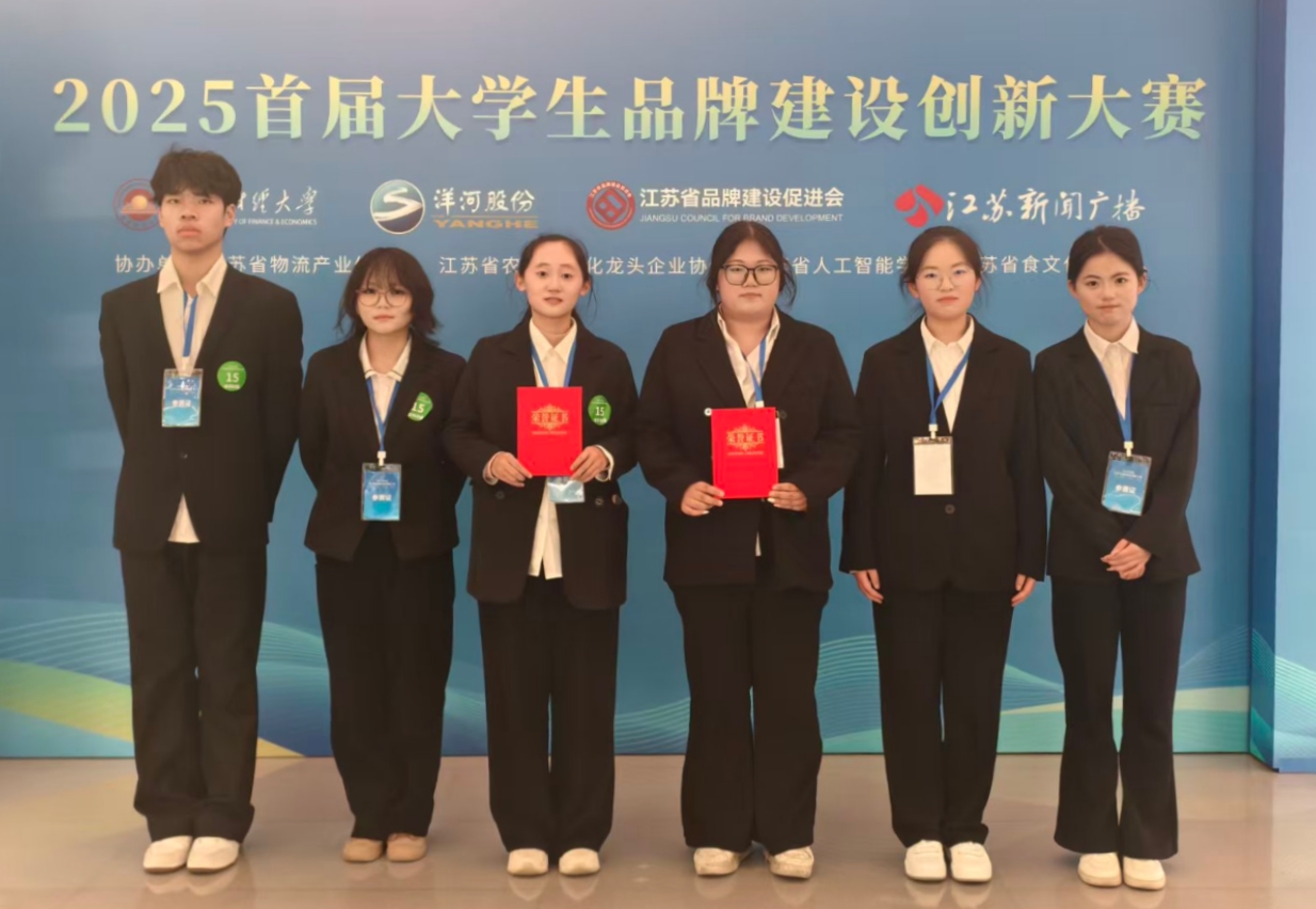 近日,2025 首届大学生品牌建设创新设计大赛决赛暨颁奖典礼在南京落幕。本届大赛主题为“讲好品牌故事,智创品牌未来”。我校学子凭借扎实的专业功底、敏锐的市场洞察力以及富有活力的创新思维,在长三角地区 40 余所高校、59 支决赛队伍的激烈竞争中脱颖而出,荣获一等奖 1 项、二等奖 1 项。
