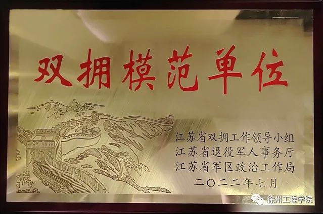 在江苏省第十二届双拥模范城命名暨双拥模范单位和先进个人表彰大会上,我校荣获“江苏省双拥模范单位”称号。近年来,我校创新提出“智力拥军、送学上舰”的继续教育模式,精准对接海军徐州舰官兵“素养提升、军地两用”新需求,探索并实践了以智力拥军为主线,着力技能培养和就业能力提升的“一对接三融合”军地两用人才培养模式,实现了学历教育与技能提升的相互融合、专业教育与军事教育的相互融合、信息技术与现场教学的相互融合。