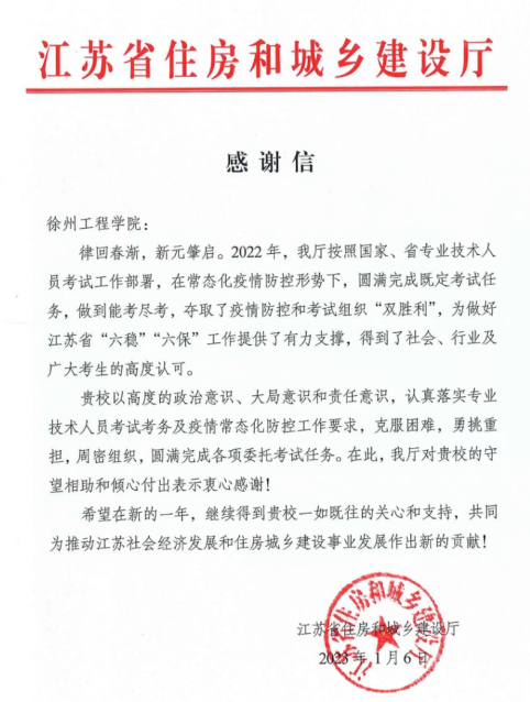 近日,我校收到来自江苏省住房和城乡建设厅的感谢信。信中省住建厅高度认可我校在疫情常态化防控形势下,圆满完成了2022年度全国勘察设计注册工程师执业资格考试工作,取得了疫情防控和考试组织的“双胜利”,为做好江苏省“六稳”“六保”工作提供了有力支撑,得到了社会、行业及广大考生的高度认可。