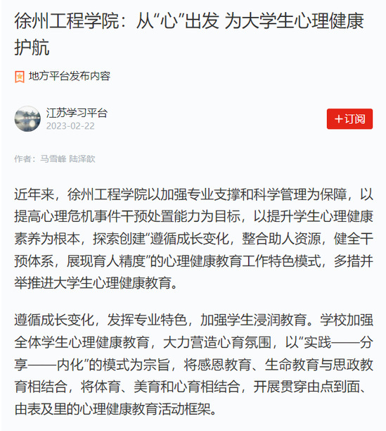 近日,学习强国江苏平台报道我校开展大学生心理健康教育特色工作。现全文转载,以飨读者。