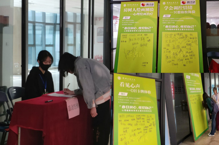 5月10日下午,校学工处举办心理健康知识宣传活动。我校张宁副校长出席。活动设置了四项趣味心理活动及心理知识展板。同学们在轻松愉悦的心理游戏中,放松心情,增长了心理健康知识,以更积极阳光的心态投入到学习生活中。4月19日-26日,校学工处举办“春日润心,悦见自己”心理团辅活动,包括OH卡牌、心理绘画、冥想体验。活动前期通过心理站长、心理委员广泛宣传,共计220名学生报名参加,分为六个时间段有序组织开展。在专职心理教师的带领下,引导学生深入地认识自己,学会调适情绪,赋能减压。