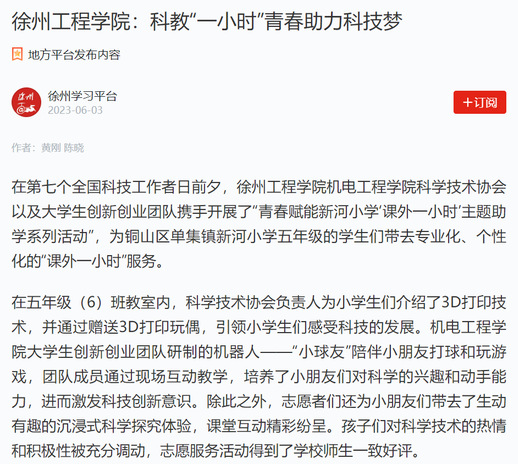 6月3日,学习强国平台以《徐州工程学院:科教“一小时”青春助力科技梦》为题,报道我校机电工程学院志愿团队为小学生开展科技服务的特色工作。